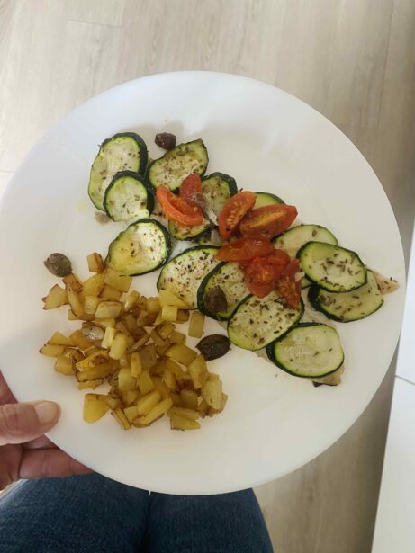 Pečený mořský vlk s cuketou, rajčátky a olivami je lehké, voňavé jídlo plné chuti — ideální pro všechny, kdo milují středomořskou kuchyni.